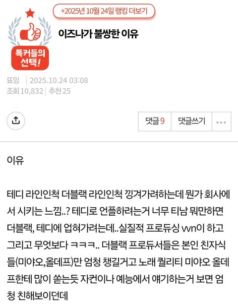 더블랙이 이즈나 홍보하고 vvn 이 더블랙 메인 프로듀서고 이즈나 수록곡 마저도 테디 손 안거친게 없는데 네들이 뭔데 더블랙 성골 진골 나누고 자빠졌음,,??? 테디가 니네거야? 애초에 엠넷에서 더블랙이랑 계약해서 이즈나라는 그룹이 나온건데 지들이 왜 극성 테디맘 행사하고 난리? 그래서 더블랙 출신 가수들이 마마같은 엠넷에서 얼굴도 비추고 상도 타고 그러겠지 ㅋㅋ 네들 가수 걱정이나 해 적어도 이즈나 팬들은 니네한테 관심조차 없어