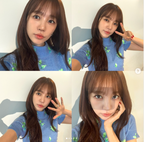 사진 속 윤은헤는 푸른색 반팔 니트를 입고 다양한 포즈를 취하며 셀카를 찍고 있다. 자연스러운 웨이브 헤어와 맑은 피부, 청초한 눈빛이 어우러져 한층 물오른 미모를 자랑한 모습.