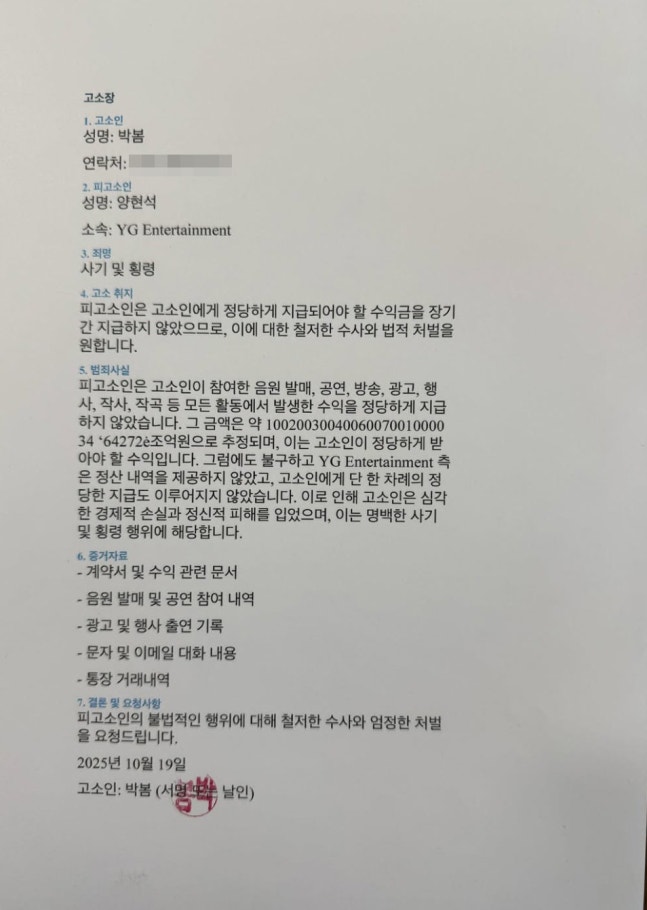 해당 문서는 박봄이 양현석 YG 총괄 프로듀서를 상대로 고소하겠다는 내용을 담은 고소장. 박봄은 양현석이 사기 및 횡령을 했다면서 “피고소인(양현석)은 고소인(박봄)에게 정당하게 지급되어야 할 수익금을 장기간 지급하지 않았으므로, 이에 대한 철저한 수사와 법적 처벌을 원한다”고 주장했다. 개인 휴대전화 번호로 추정되는 연락처도 가리지 않고 그대로 올렸다.