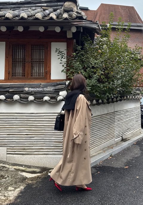 효민은 대구의 유명한 모 식당이 이곳에도 있다며 감탄한 다음 고즈넉한 한옥 골목 사이에서 발목 길이까지 오는 트렌치 코트에 새빨간 공단 소재의 붉은 뮬을 신어 고전적인 느낌을 뽐냈다. 그러면서도 큰 키로 오버 사이즈 트렌치 코트를 세련되게 소화하는 믹스매치를 선보였다.