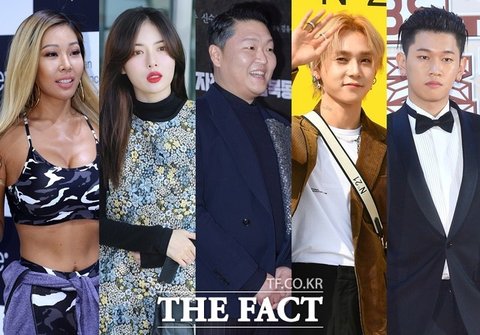 싸이(가운데)가 설립한 음악 레이블 피네이션이 지난해 하반기부터 왕성하게 결과물을 내놓고 있고 좋은 성과를 내기 시작했다. 왼쪽부터 제시, 현아, 싸이, 던, 크러쉬. /더팩트 DB