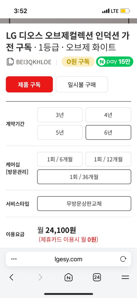 제휴카드 만들고 6년 구독하면 매달 0원으로 이용 가능하대요카드 안만들어도 거의 반년치 구독료 네이버페이 포인트로 돌려주네요어차피 인덕션 같은 가전은 바꿀 일이 잘 없으니까 합리적인것같아요