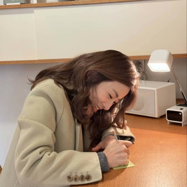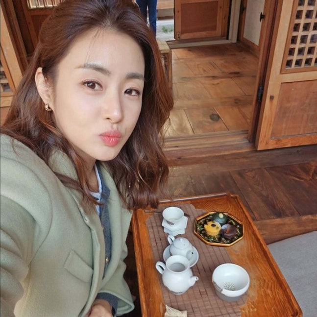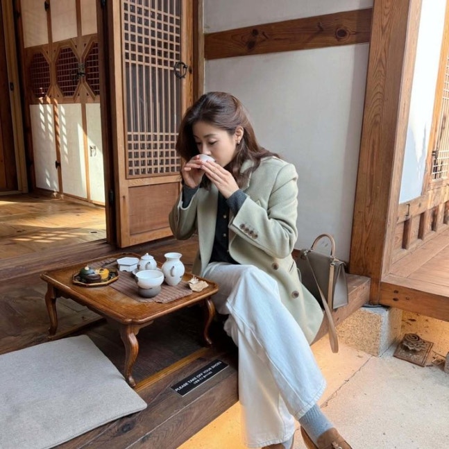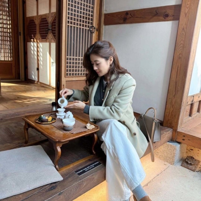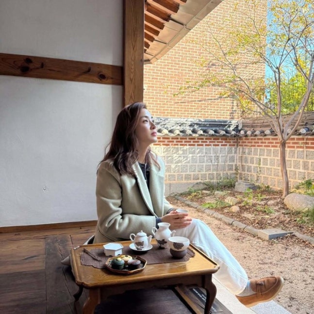 공개된 사진 속 강소라는 고즈넉한 한옥 공간에서 따뜻한 차를 마시며 여유로운 시간을 보내고 있다.