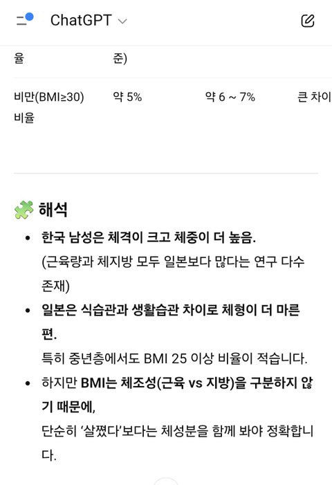 그리고 bmi는 단순 키대비 체중인데 실제 다른 연구결과에서는 우리나라가 육류소비가 더 많아서 근육량이 더 높고 체지방율이 더 낮다고함