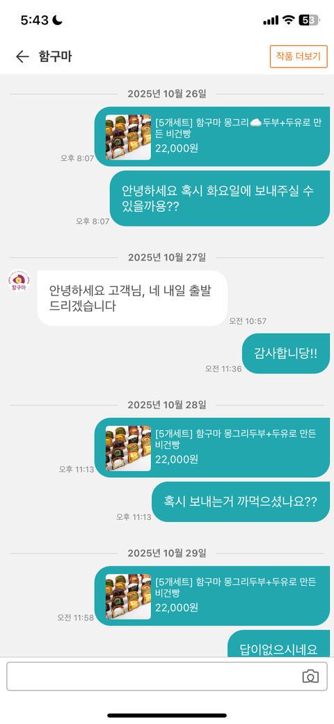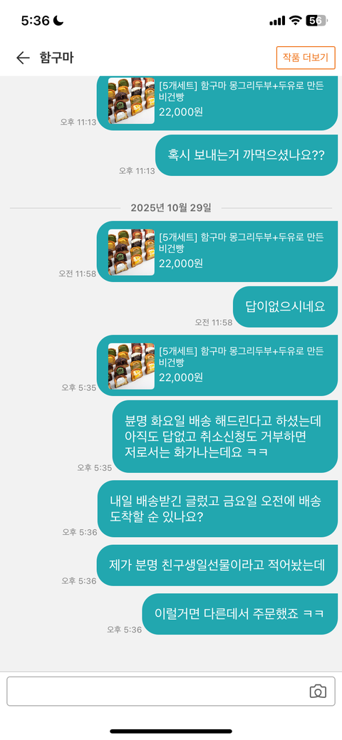 나는 혹시 늦게보내도 문의로 답만 주면 아 알겠습니다 하고 넘기는 편인데 약속날짜도 안 지키고 문의 답도 쌩까고 약속한 날짜 지나도 배송도 안보내고 아무 답도 없길래 취소신청 했는데 취소거부 처리하고 쌩까는게 너무 괘씸해죽겠음 저거 목욜에 받아서 친구한테 줘야하는데 금요일에 받기도 늦음 도대체 왜 답을 안하는지 모루겠네 고구마 쳐먹은기분임 지금까지도 아무소식없다 저따구로 장사하면 편한가 ㅋ