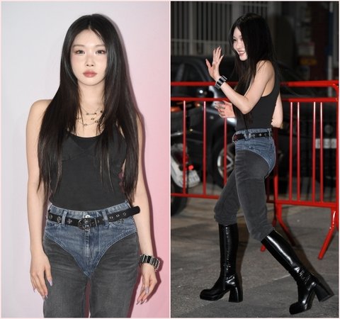 포토월에 선 청하는 컬러가 다른 입체적인 절개 라인의 진 팬츠와 블랙 민소매, 롱부츠를 매치해 시크하면서도 강렬한 분위기를 완성했다.