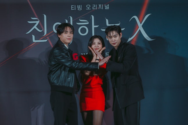 30일 오후 서울 CGV 용산아이파크몰에서 티빙 오리지널 <친애하는 X>가 제작발표회를 열었다. 현장에서 포즈를 취하고 있는 김도훈(왼쪽부터), 김유정, 김영대. [티빙 제공]이날 제작발표회 현장은 또래 배우들과 이에 만족하는 감독님과의 케미로 시종일관 웃음이 끊이질 않았는데, 가까운 거리감에 최근 김유정과 김도훈은 열애설이 나기도.