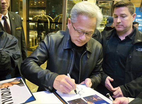 (사진4 설명) 시민들에게 사인 젠슨 황 엔비디아 최고경영자(CEO)가 30일 서울 삼성동 웨스틴서울파르나스호텔 앞에서 만난 시민들에게 사인해주고 있다. 황 CEO는 이날 시민들에게 치즈스틱과 치킨을 나눠주는 등 친근한 소통 행보를 보였다. /강해령 기자