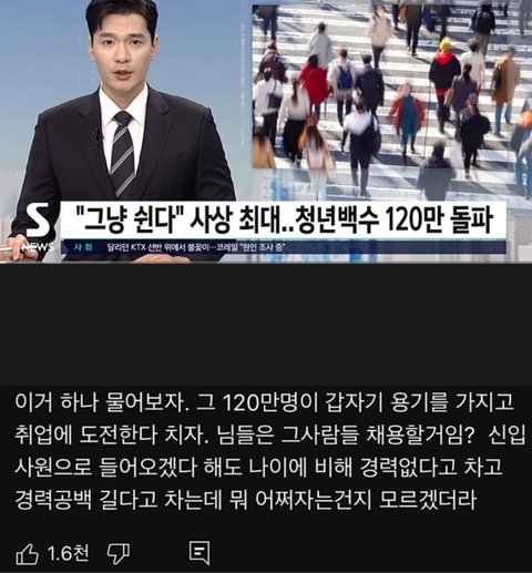 어그로 끄려고 저따구로 제목 뽑는 거 ㅈ같다 심지어 뉴스잖아…그냥 쉰다,청년백수 요지랄ㅋㅋ
