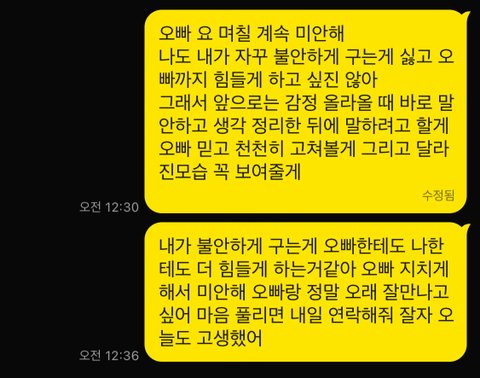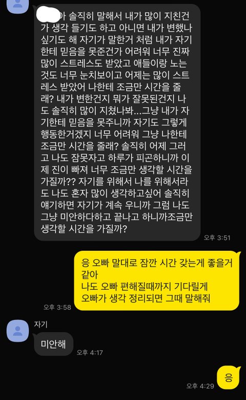 전 20살이고 남자친구는 26살 입니다제가 평소에 눈물이 많아서 싸우거나 할때 많이 울었는데 이게 남자를 지치게 한다는걸 이제 알았고 제가 최근 며칠 불안해서 불안하단 소릴 몇번 남친한테 했었어요 근데 남자친구도 지쳤는지 시간을 가지자고 하는데 카톡내용 보고 혹시나 마음 진짜 정리하고 있는 상탠지 확인해 줄수 있을까요?