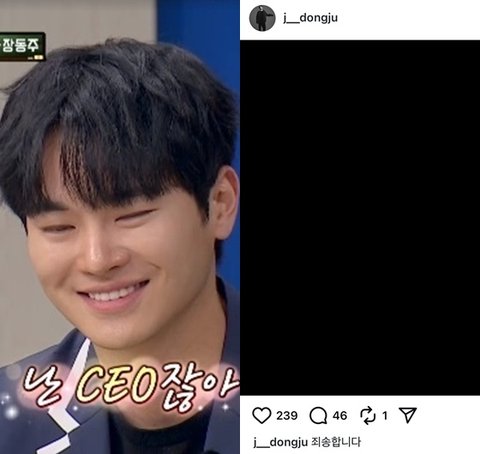 배우 장동주(31)가 난데없는 공개 사과로 네티즌들의 이목을 집중시켰다.장동주는 31일 오전 자신의 인스타그램에, 검은색 바탕의 사진 한 장과 함께 "죄송합니다"라는 사과를 남겼다.