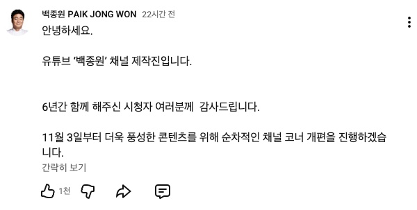 지난달 31일 유튜브 채널 백종원 제작진은 "6년간 함께 해주신 시청자 여러분께 감사드린다. 11월 3일부터 더욱 풍성한 콘텐츠를 위해 순차적인 채널 코너 개편을 진행하겠다"라고 공식입장을 밝혔다.