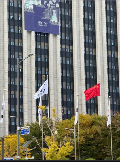 "정부서울청사에 걸린 중국 오성홍기"