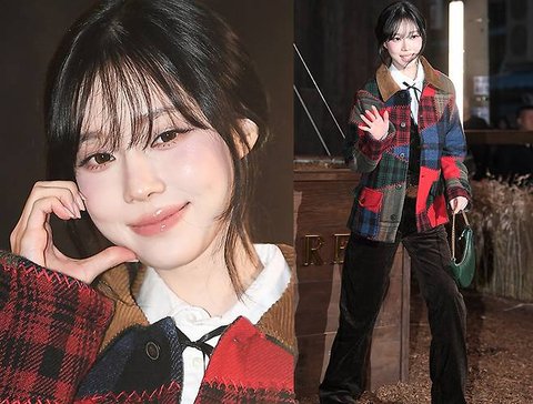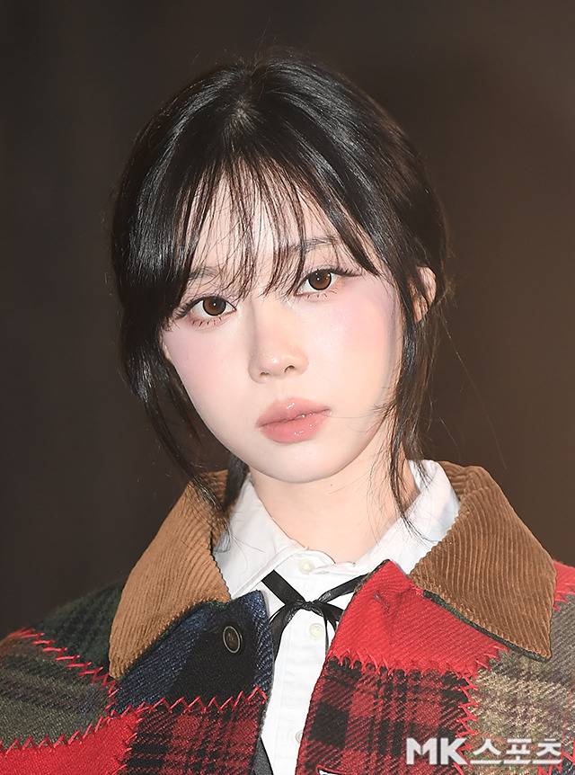 윈터는 자연스럽게 흐르듯 내려오는 시스루 뱅과 잔머리를 살린 로우 번 스타일은 얼굴 윤곽을 부드럽게 감싸며 특유의 청초한 분위기를 배가시켰습니다.