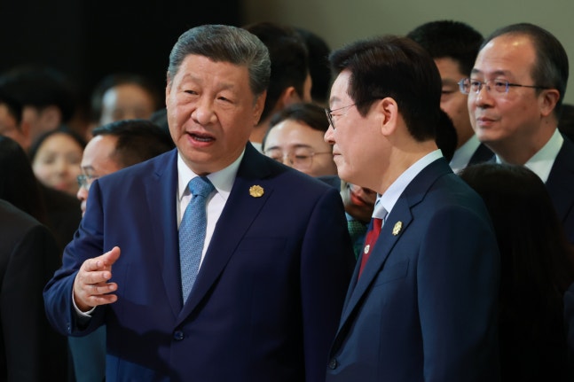 대화하는 이재명 대통령과 시진핑 국가주석(경주=연합뉴스) 특별취재단 = 이재명 대통령이 31일 경북 경주시 라한셀렉트호텔에서 열린 2025 아시아태평양경제협력체(APEC) 정상회의 갈라만찬 영접장에서 시진핑 중국 국가주석과 대화하고 있다. 2025.10.31
