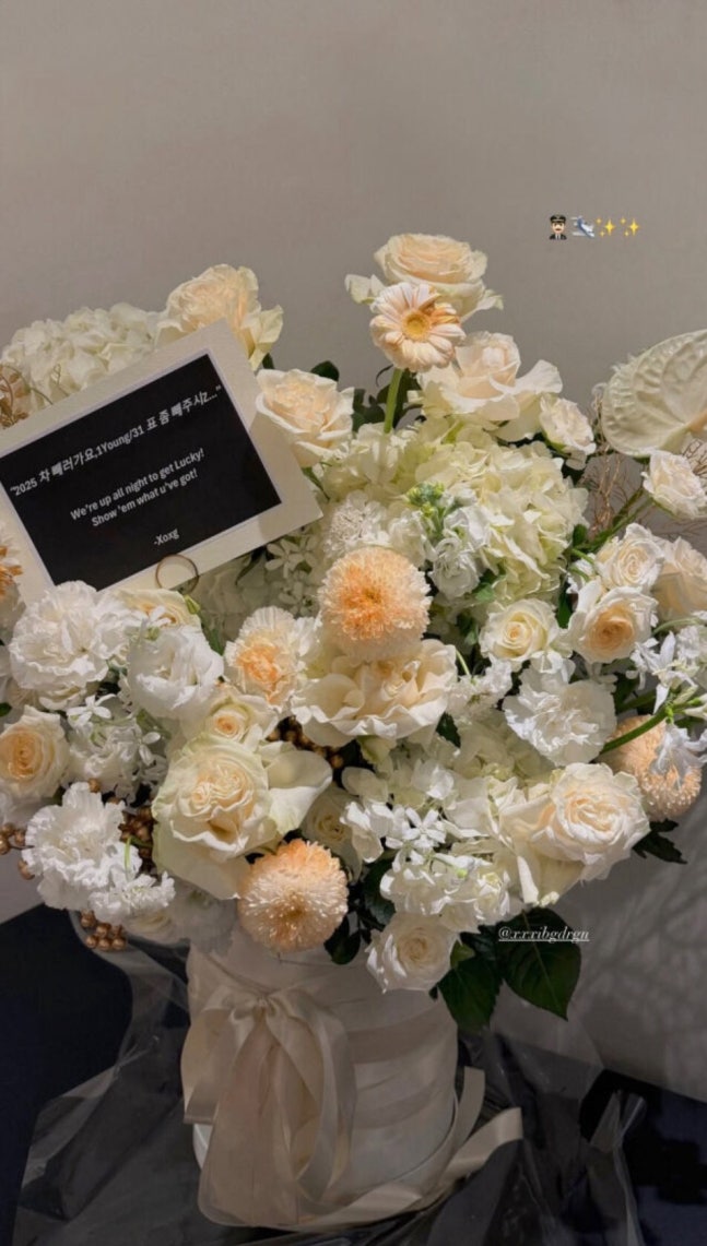 카드에는 ‘2025 차 빼러 가요, 1young/31 표 좀 빼주시Z… We’re up all night to get Lucky! Show ’em what u’ve got! -Xoxg(우리는 행운을 얻기 위해 밤을 지새웠어! 네가 가진 걸 보여줘!)’라는 메시지가 적혀 있었다.