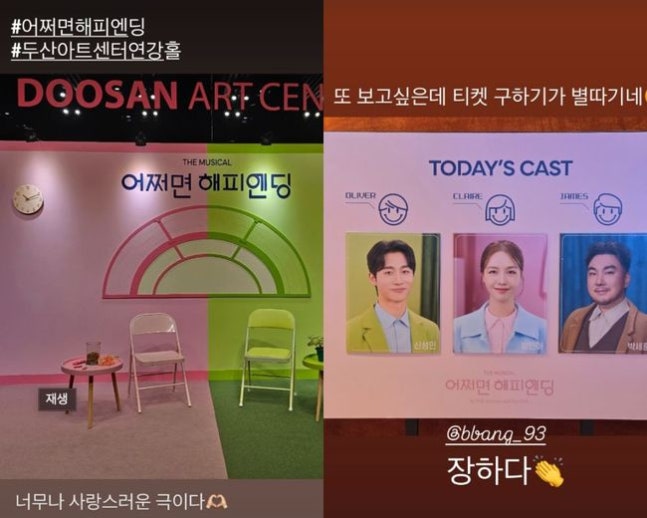1일 온주완은 자신의 SNS에 “너무나 사랑스러운 극이다. 또 보고 싶은데 티켓 구하기가 별따기네”라는 글과 함께 뮤지컬 ‘어쩌면 해피엔딩’ 포토월과 캐스팅 보드 사진을 게재했다. 이날은 방민아의 첫 공연이 열린 날이었다.