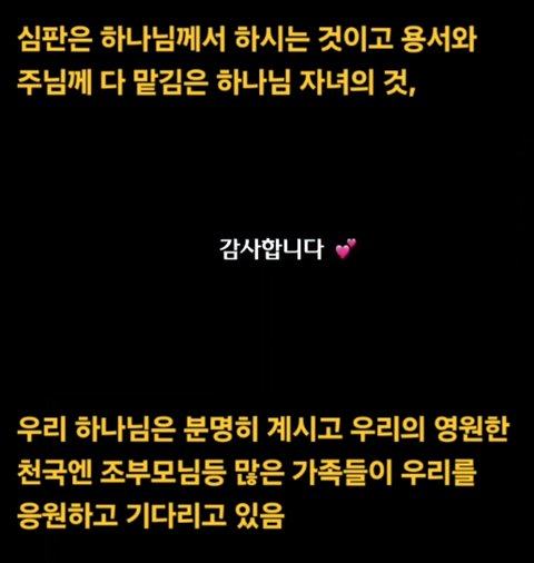 상한 마음의 치유들: 사랑의 마음이 가득할 때 하늘의 복을 받아 선한 인도가 가득해짐, 악한 생각은 없는 악령까지 생각해 만들어 자신을 괴롭힘, 주위 힘들게 하는 사람들을 아이같이 불쌍히 여겨 사랑으로 돌볼때에 분위기를 행복으로 바뀔 수 있음, 정치는 하나님 나라와 달리 모두 틀리기에 깊이 몰입해선 안됨, 과거의 상처의 회상은 더 깊어 질뿐 용서와 잊음이 최고의 치료법 심판은 하나님께서 하시는 것이고 용서와 주님께 다 맡김은 하나님 자녀의 것, 우리 하나님은 분명히 계시고 우리의 영원한 천국엔 조부모님등 많은 가족들이 우리를 응원하고 기다리고 있음
