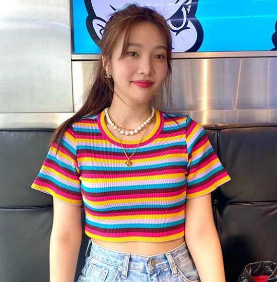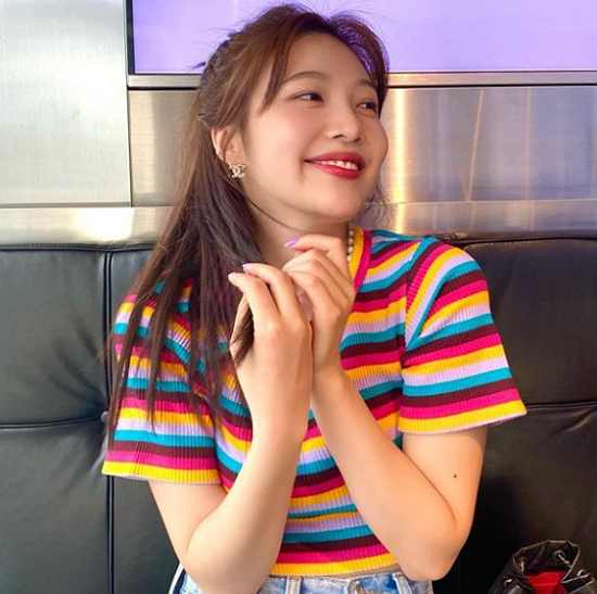 공개된 사진에는 화사한 스트라이프 크롭티에 청바지를 입고 남다른 패션센스를 자랑한 조이의 모습이 담겼다.