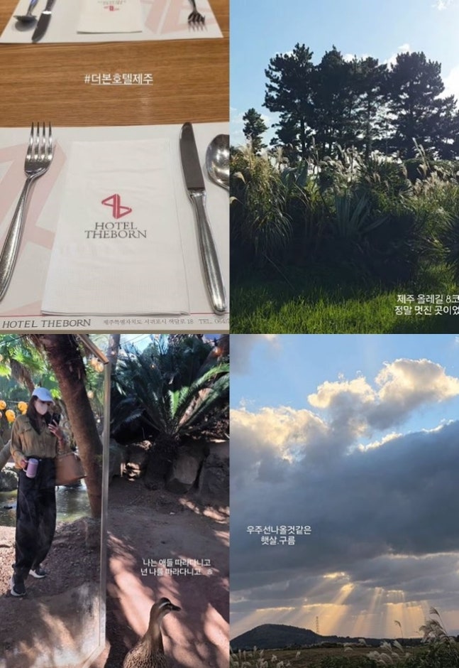 이어 그는 "제주 올레길 8코스. 정말 멋진 곳이었다" "나는 애들 따라다니고 넌 나를 따라다니고" "우주선 나올 것 같은 햇살 구름"이라는 글과 함께 제주 곳곳의 풍경을 담았다.
