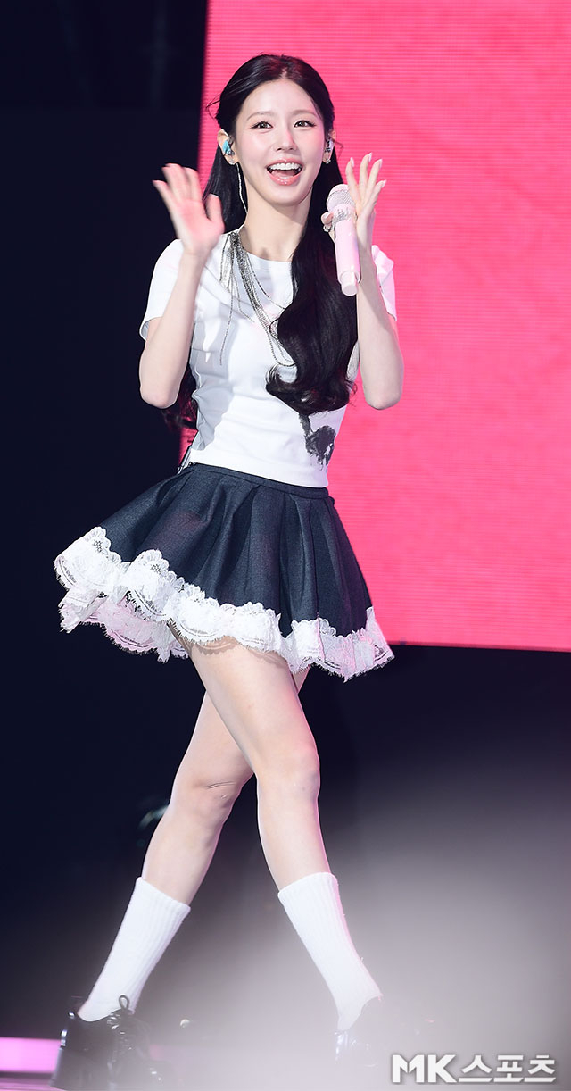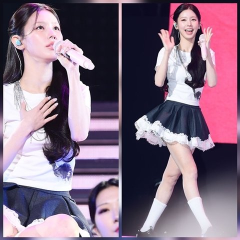 하얀 티셔츠와 블랙 레이스 스커트, 반짝이는 블랙 힐 부츠로 무대에 오른 미연은 순수함과 세련된 카리스마를 동시에 담아냈다. 자연스러운 웨이브 헤어와 맑은 핑크빛 메이크업은 부드러움 속의 자신감을 완성했다.