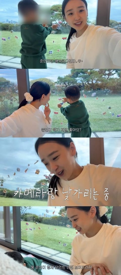 손연재는 아들과의 일상을 공개했다. 아들은 요즘 스티커에 푹 빠졌다고. 손연재는 “저희 창문이 이렇게 됐다”라며 스티커로 도배된 넓은 창을 공개했다.