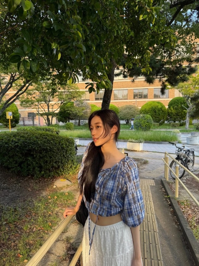 공개된 사진 속 그는 푸른 체크 블라우스와 화이트 롱스커트를 매치한 내추럴한 스타일링으로 공원과 호숫가를 배경으로 감성적인 분위기를 연출했다.