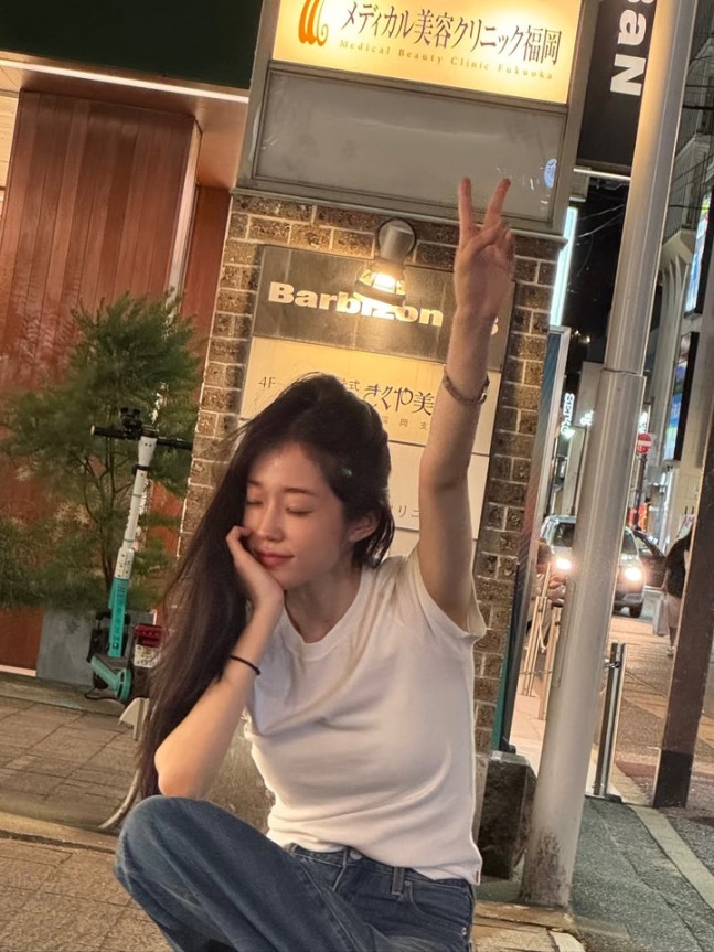 또 다른 사진에서는 깔끔한 화이트 티셔츠에 데님 팬츠를 입고 도시의 밤거리에서 여유로운 포즈를 취하며 편안한 무드를 더했다. 자연스러운 미소와 포즈가 돋보이며, 특유의 청순한 매력이 사진 전반에 묻어난다.