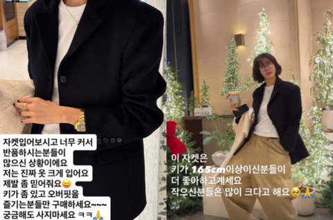 이어 "자켓 입어보시고 너무 커서 반품하시는 분들이 많으신 상황"이라며 "저 진짜 옷 크게 입는다구요. 제발 좀 믿어줘요. 키가 좀 있고 오버핏을 즐기시는 분만 구매하세요~ 궁금해도 사지마세요"라고 사이즈에 대한 당부의 말을 전했다.