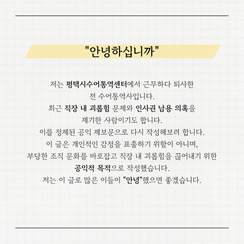 저는 평택시수어통역센터에서 근무하다 퇴사한 전 수어통역사입니다. 최근 직장 내 괴롭힘 문제와 인사권 남용 의혹을 제보했던 사람이기도 합니다. 제가 제보한 글이 정제되지 않고 전문 그대로 공유될 줄 예상치 못해 공식적인 제보문으로 다시 작성합니다.