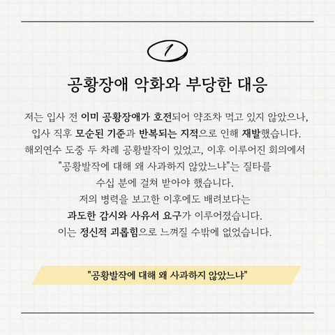 하지만 실제로는 센터장이 병력을 알고 난 후에도, 저는 공황장애에 대한 배려보단 날선 시선과 부담을 주는 분위기를 느꼈습니다. 제가 화장실에 다녀올 때마다 다른 직원들에게 제 행방을 일일이 물어가며 찾으시고, 단체 채팅방에서 공개적으로 언급하거나, 사유서를 요청하기도 하셨습니다. 사유서를 제출했을 때 ‘입사한 이후로 악화되었다'는 부분을 삭제하라며 반려하시기도 하셨습니다.