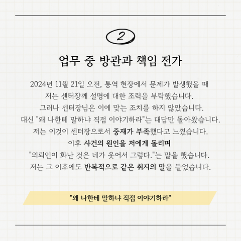 센터장은 신입 통역사인 저에게 “직접 이야기하라"며 개입 및 중재를 하지 않았습니다. 이에 어쩔 수 없이 혼자서 친절히 설명도 해 보고 애써 웃으며 달래도 드리고 그림까지 그려 가며 설명을 드렸습니다. 그럼에도 센터장은 적극적인 조치도 취하지 않았고, 병원에 있는 환자와 의료진들이 피해를 보고, 상황은 끝나지 않았습니다. 이를 중재하고자 선임 통역사에게 조언을 구하려 했으나, 통역 중이거나 급한 업무 중이셨습니다. 그 와중에 저는 위경련이 와서 허리를 펴기 어려운 상황이 되었습니다. 어쩔 수 없이 휴가 중인 특정 직원에게 조언을 구했습니다. 센터장은 이후 여러 차례에 걸쳐 “왜 그 직원에게 전화를 했느냐"고 질책했습니다. 이는 2024년 11월에 있었던 일이었지만 퇴사 직전인 2025년 6월까지도 “왜 그 직원에게 전화를 했느냐"는 같은 질책이 반복되어 심리적으로 위축되었습니다.