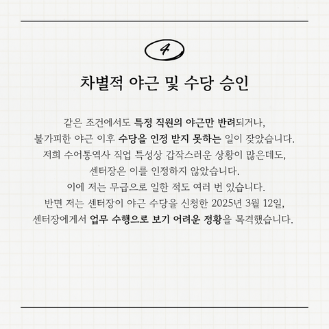 반면 저는 센터장이 야근 수당을 받은 날 실제로 근무 수행으로 보기 어려운 정황을 목격했습니다. 2025년 3월 12일 저는 야근을 하고 있었고 센터장과 한 직원이 원탁에 앉아 간식을 먹고 대화를 나누었습니다. 센터장은 일이 많아 야근을 하는 거라고 언급했으나, 책상에는 단 한 차례도 앉지 않고 퇴근하는 걸 목격했습니다. 이후 제가 담당인 시간 외 신청서 및 확인서를 확인하니 해당 일자에 야근 수당을 신청한 것을 확인했습니다. 이런 것은 야근이 인정되고 직원들이 진짜 일한 시간은 인정되지 않는다는 것이 납득하기 어려웠습니다.
