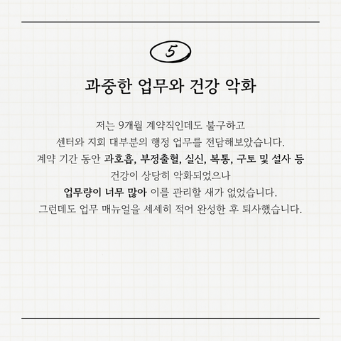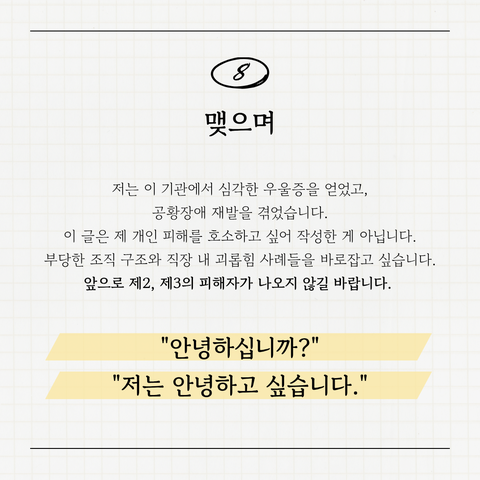 저는 이 기관에서 심각한 우울증과 악화된 공황장애를 얻고 퇴사했습니다. 하지만 남아 있는 동료들, 앞으로 이 기관과 함께하게 될 직원들이 같은 고통을 겪지는 않았으면 좋겠습니다.