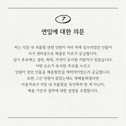 저는 단순히 저의 억울함이나 감정을 표현하고 싶은 게 아닙니다. 저는 이 기관을 떠났지만, 이것이 저만의 문제가 아니라는 것을 잘 알고 있습니다. 직장 내 괴롭힘이 얼마나 교묘하게 지속되는가를 적나라하게 보았습니다.