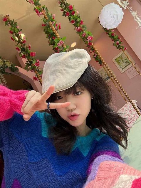 그는 드라마 '미안하다 사랑하다'에서 임수정이 입었던 알록달록한 색의 니트를 입고 손으로 브이 포즈를 취했다.