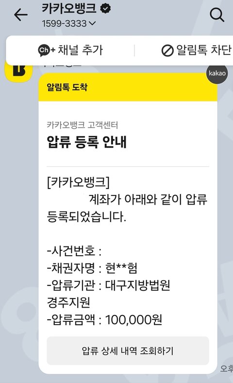 이러한 '종결 및 선고' 사실을 알게 된 것 또한 바로 오늘, 카**뱅크의 계좌 '압류 알림'에 사건 번호가 있기에