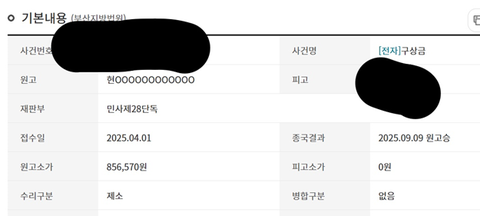 하지만 그게 아니었습니다. 보험사에서는 2025년 7월 부산지방법원에 소송을 걸었고(청구액 856,570원), 저희는 소장도 받아보지 못한 채 9월 9일 '종결 및 선고'를 당했습니다.