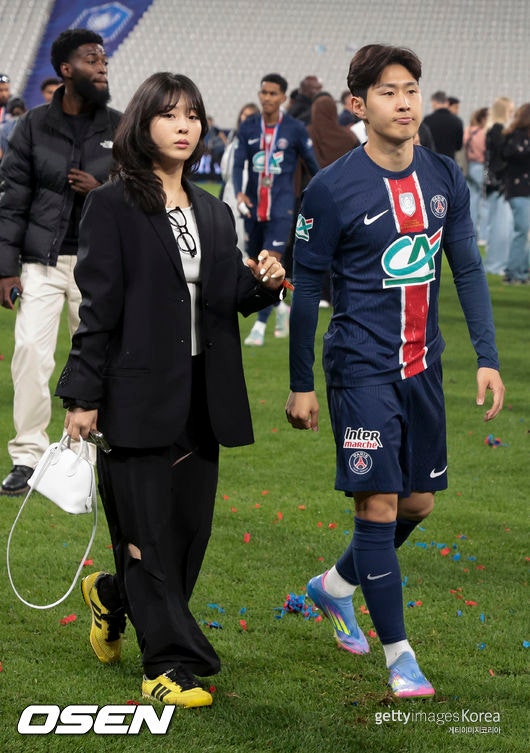 [사진] ⓒGettyimages(무단전재 및 재배포 금지)뿐만 아니라 지난 5월에는 이강인이 속한 파리 생제르맹이 ‘프랑스컵’ 결승전에서 우승한 뒤 가족들과 함께 축하를 나누는 우승 세레머니 현장에 박상효가 목격돼 화제를 모았다.