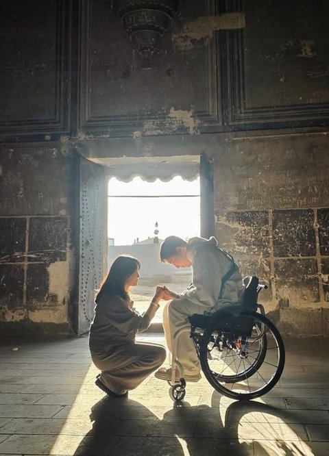 사진 속 송지은은 휠체어에 앉은 박위의 두 손을 잡은 채 마주보고 있다.