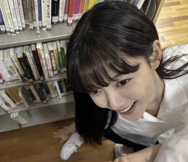 [김유정 인스타그램]앞머리를 내린 긴 생머리에 교복을 입고 도서관 책장 앞에서 웃음 짓는 표정은 영락없는 고등학생 모습이다.