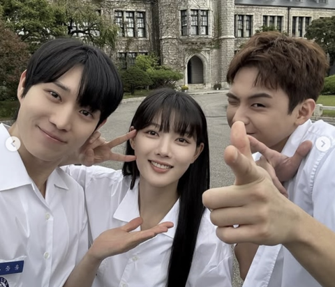 6일 김유정은 자신의 계정에 “오늘 친애하는X 6시”라는 글과 함께 여러 장의 사진을 올렸다. 이날 공개된 사진들에는 김유정이 <친애하는 X> 촬영 현장에서 교복 차림을 한 채 동료들과 어울리는 모습이 담겼다.