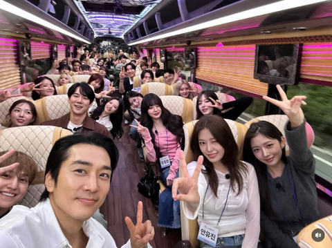 사진 속 송승헌은 버스 안에서 휴대폰을 들고 직접 셀카를 찍고 있다. 양옆에는 장원영과 안유진, 뒤쪽에는 스타쉽 아티스트들이 가득 차 있다.