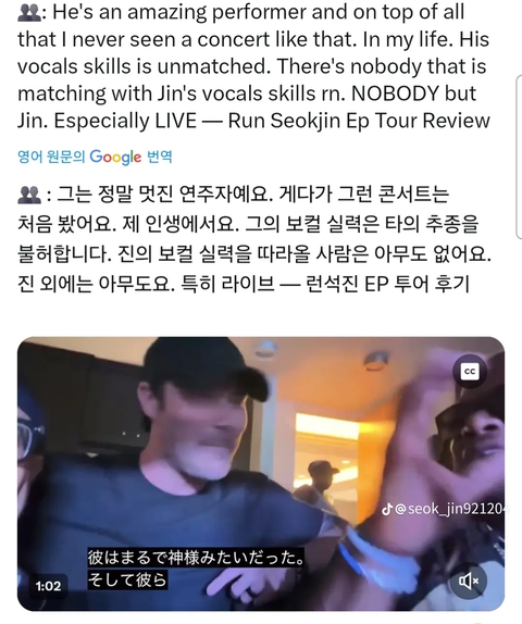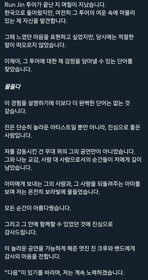 케이팝 가수들이랑 작업하는 밴드 기타리스트가 해외솔로투어 진이랑 함께 하면서 진에게만 유일하게 긴 글 남김 ♡ 진은 진정한 아티스트이기도 하면서 진실로 좋은 사람이다 꼭 다시 함께 무대에 서고 싶다고