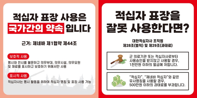 적십자 표장 잘못된 사용과 관련한 적십자사 캠페인. 적십자사 홈페이지적십자는 “‘적십자 표장’을 잘못 사용할 경우 1000만원 이하 벌금이나 500만원 이하 과태료가 부과될 수 있다”며 “적십자 표창을 상표법에 따른 상표로 출원해 침해죄가 적용되면 최대 7년 이하 징역이나 1억원 이하의 벌금에 처해질 수 있다”고 안내하고 있다.