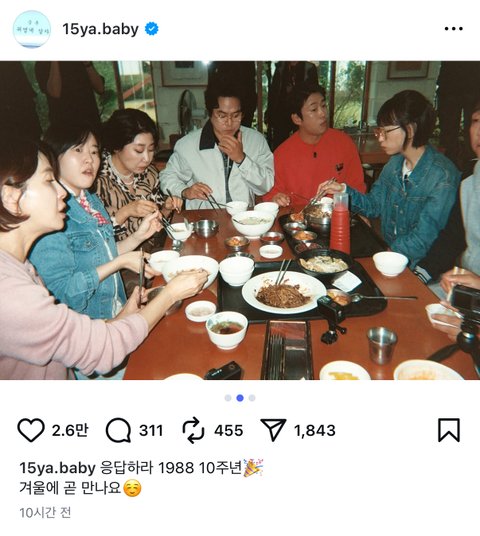 채널 십오야 측은 6일 SNS에 단체 MT 사진을 올렸다. "'응답하라 1988' 10주년. 겨울에 곧 만나요"라고 적었다.