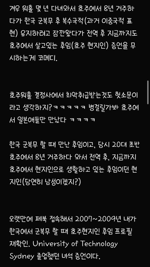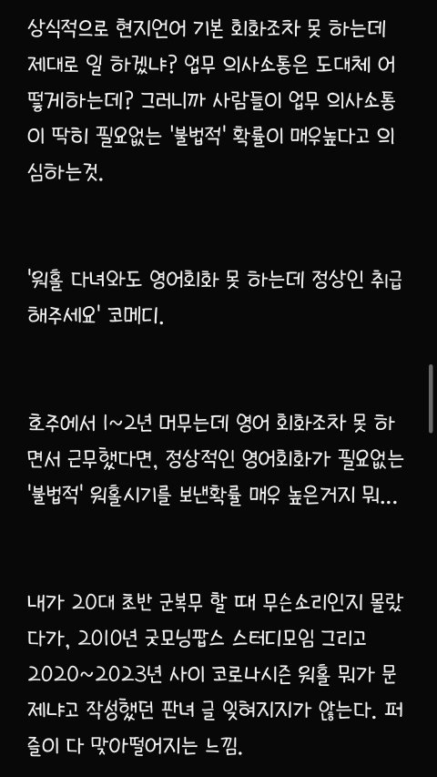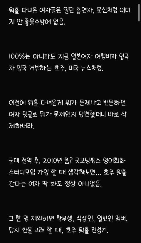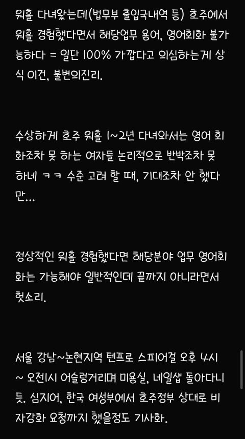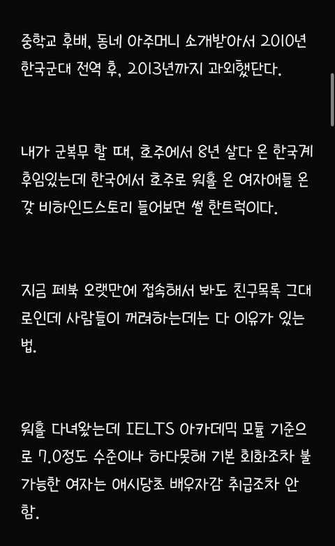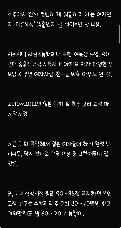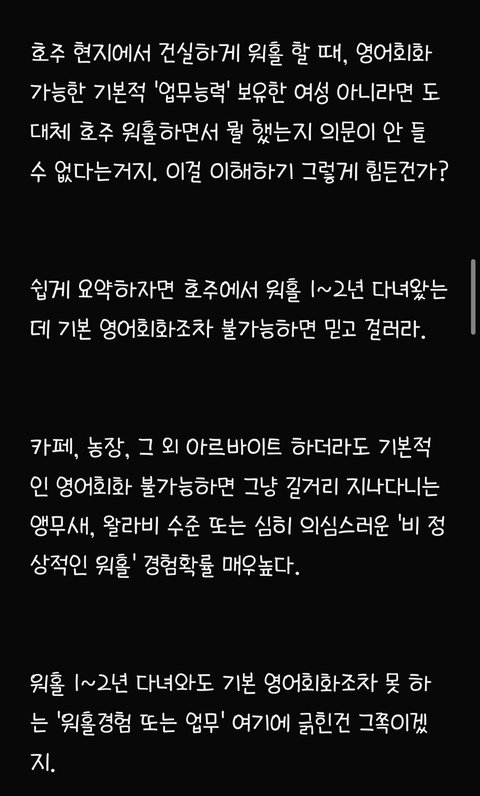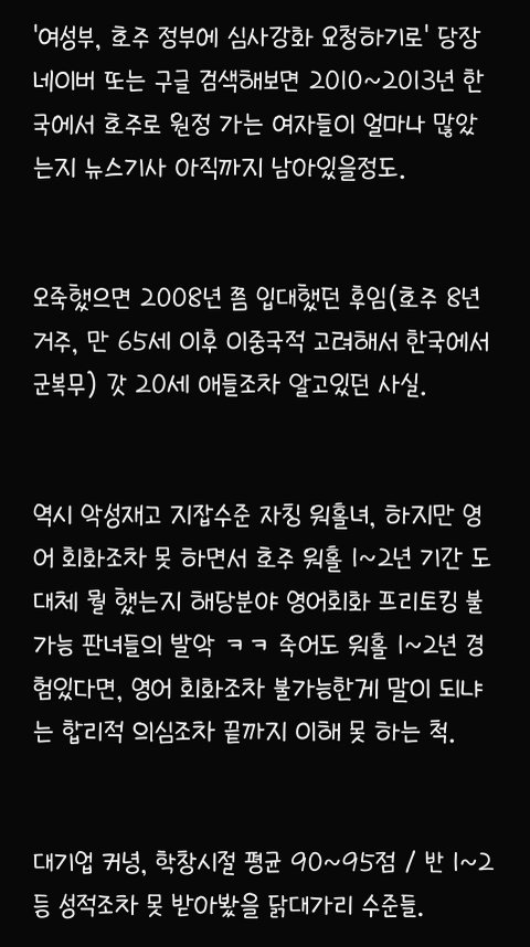 82년생 아줌마이고 글쓴님이 본문에서 쓴 것처럼 제가 딱 2010년도에 호주 워홀 와서 어찌저찌 영주권 따고 지금까지 눌러살고 있어요 저 첨 워홀왔을 당시, 진짜 하이랑 헬로우밖에 못했구요 영어가 안되서 워홀 가자마자 딱히 영어실력이 크게 필요없는 농장지역가서 토마토랑 애호박 따면서 일년동안 그 당시 4만불 (약 4천만원) 모았어요 그 당시 한국사람들은 멀리하고 같은 농장에서 일하던 유럽 출신친구들하고 어울리면서 되든 안되든 한국말 안쓰고 영어만 썼더니 어느 순간 신기하게 영어가 통 문장으로 들리기 시작하더라구요 호주 있다보니까 한국 돌아가기 싫어져서 유학원 가서 영주권 받기 유리한 직종 알아보고 추후 학생비자로 바꿔서 호주에서 관련 학교 졸업했어요 (한국에서 건, 동, 홍 중 한 곳 졸업했음, 대학을 두 번 다닌 셈) 그 쪽으로 경력쌓고 영주권 받았어요 저처럼 워홀와서 차근차근 경력쌓고 영주권 받은 토종 한국인 남편(용접일하다가 영주권 따고 지금은 치기공사로 일함ㅡ 연봉 세후 8만불 , 약 8천만원)이랑 결혼도 했고 예쁜 딸래미도 낳았어요 전 현재 호주에서 간호사로 일하고 있구요 영주권 딸 당시 IELTS 아카데믹으로each 8.0 받았었습니다 (이 정도면 거의 원어민 수준이라고 하더라구요) ㅡ 세후 연봉 9만불 (약 9천만원) 현재 브리즈번 외곽에 수영장 딸린 타운하우스 형 집 2채 보유중 (다른 한채는 렌트 돌려요) 포르쉐, 픽업트럭형 토요타, SUV형 벤츠 보유중이고 약 1억원 상당의 요트와 스킨스쿠버 장비도 보유중입니다 한국에서 살고 계시는 시댁 친정에 평생 드릴 용돈 미리 일시불로 드린다는 명목으로 각각 2억씩 땡겨서 드렸어요 참고로 저보다 8살연하인 저희 남편, 한국에서 고졸이었고 집안형편도 어렵고 딱히 공부도 못해서 일찌감치 실업계고 가서 용접공으로 취업했는데 그 당시 한 달 월급 80~100 사이었고 그 마져도 밀리고 제 때 받지 못했었답니다 어딜가든 고졸이라고 무시당했었데요 그리하여 한국생활에 회의감 느끼고 군대갔다 전역하자마자 한국 생활 다 접고 워홀 온 케이스입니다 아마 울 남편이 호주 안오고 계속 한국에서 살았다면 고졸딱지붙고 그저그런 인생살면서 결혼시장에서 도태남 각이었을 거라고 지금도 본인이 말 해요 ㅋ