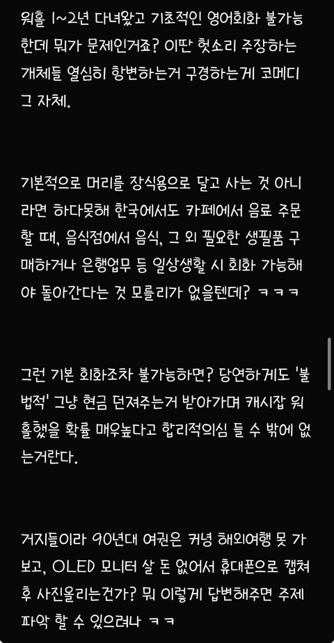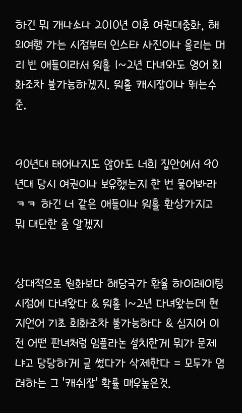 글 쓴거 보니까 본인도 수준 허접한거 같은데 남까느라 신났네. 무슨 본인 사립 초등학교 나온거며 부모님 3억 자가 매입 뭔 자서전 읽는 줄. 지가 경험한거도 아니고 다 카더라.. 난 일본 3년, 미국 20년╋ 살고 있는데 뭔소린지 모르겠음. 한국에서 전환점을 못찾거나 해외 경험은 해보고 싶은데 돈없고 그러면 도전해 볼 수도 있지. 저런 걸 떨어진 애하고 결혼하느니 해외 경험 하는게 낫지. 어휴 찌질해.