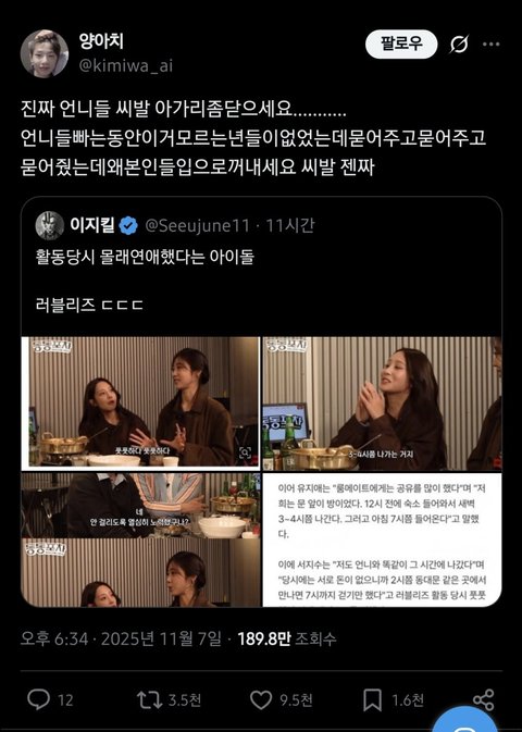 누가 연애하지 말랬냐 입좀 닫으란 거지 다른 돌들한테도 피해주네 사생들이 새벽까지 감시하겠어