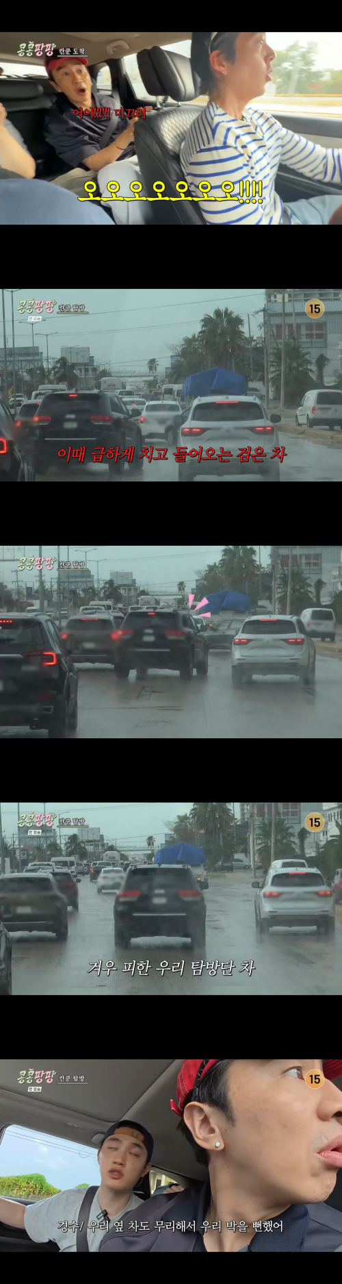 칸쿤 공항에 도착한 직후, 렌터카를 빌려 해물라멘 맛집으로 향하던 세사람은 뜻밖의 교통사고 위기에 직면했다. 운전대를 잡은 사람은 김우빈. 한참을 달리던 중 세 사람은 “어어어어” 하며 깜짝 놀랐다. 옆 차선을 달라던 검은 차량이 갑자기 세 사람이 탄 차 앞으로 급하게 끼어든 것.